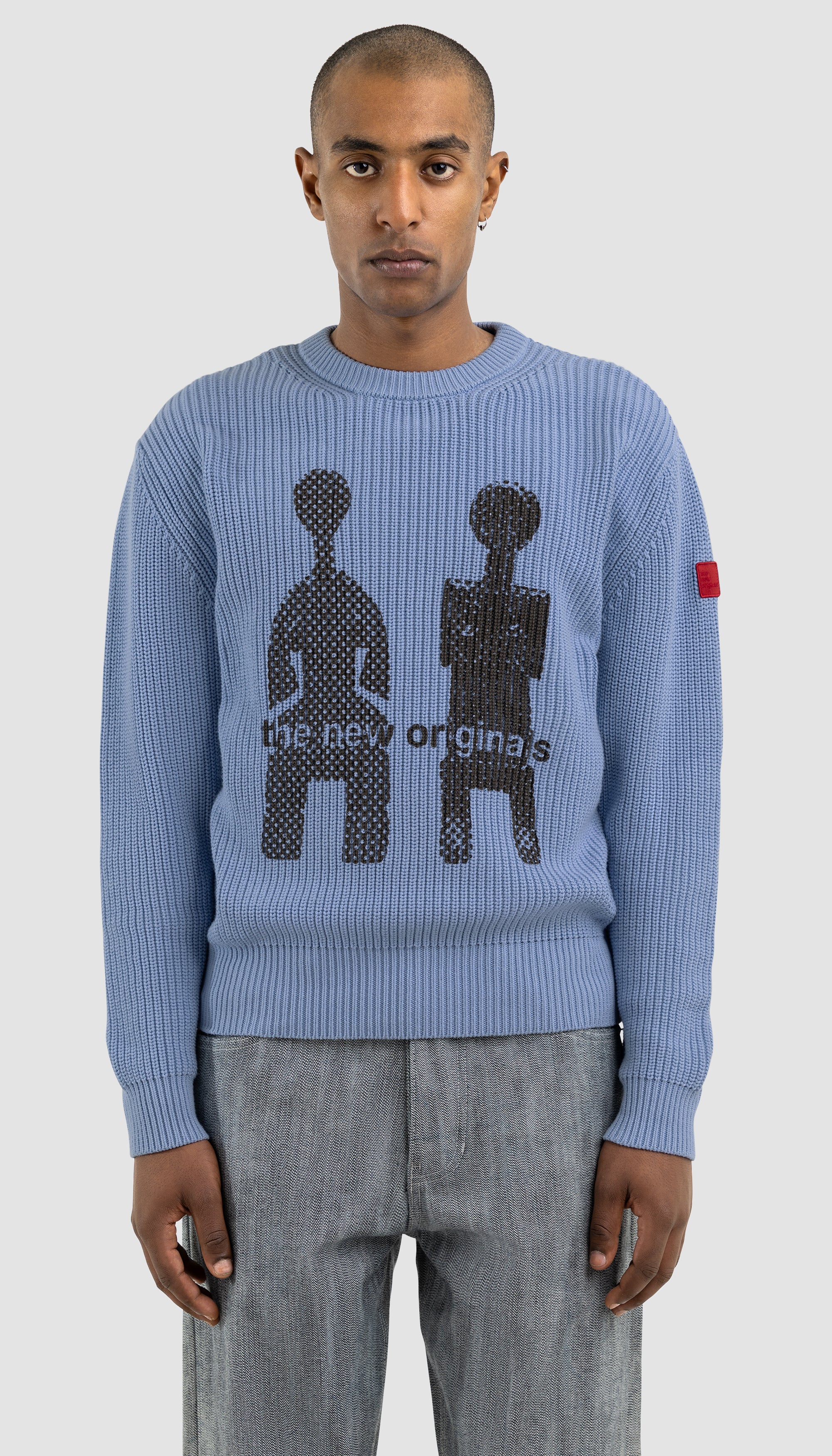 The 2 Figures Fisherman Crewneck in Serenity is constructed using a fully fashioned shaker stitch (Half Fisherman’s Rib) for a structured yet flexible feel. The 2 Figures graphic is knit into the chest using a dot technique, giving the piece subtle texture and visual depth. Crafted in a mid-heavy gauge for everyday comfort. Finished with ribbed trims and our woven red The New Originals patch on the sleeve.
