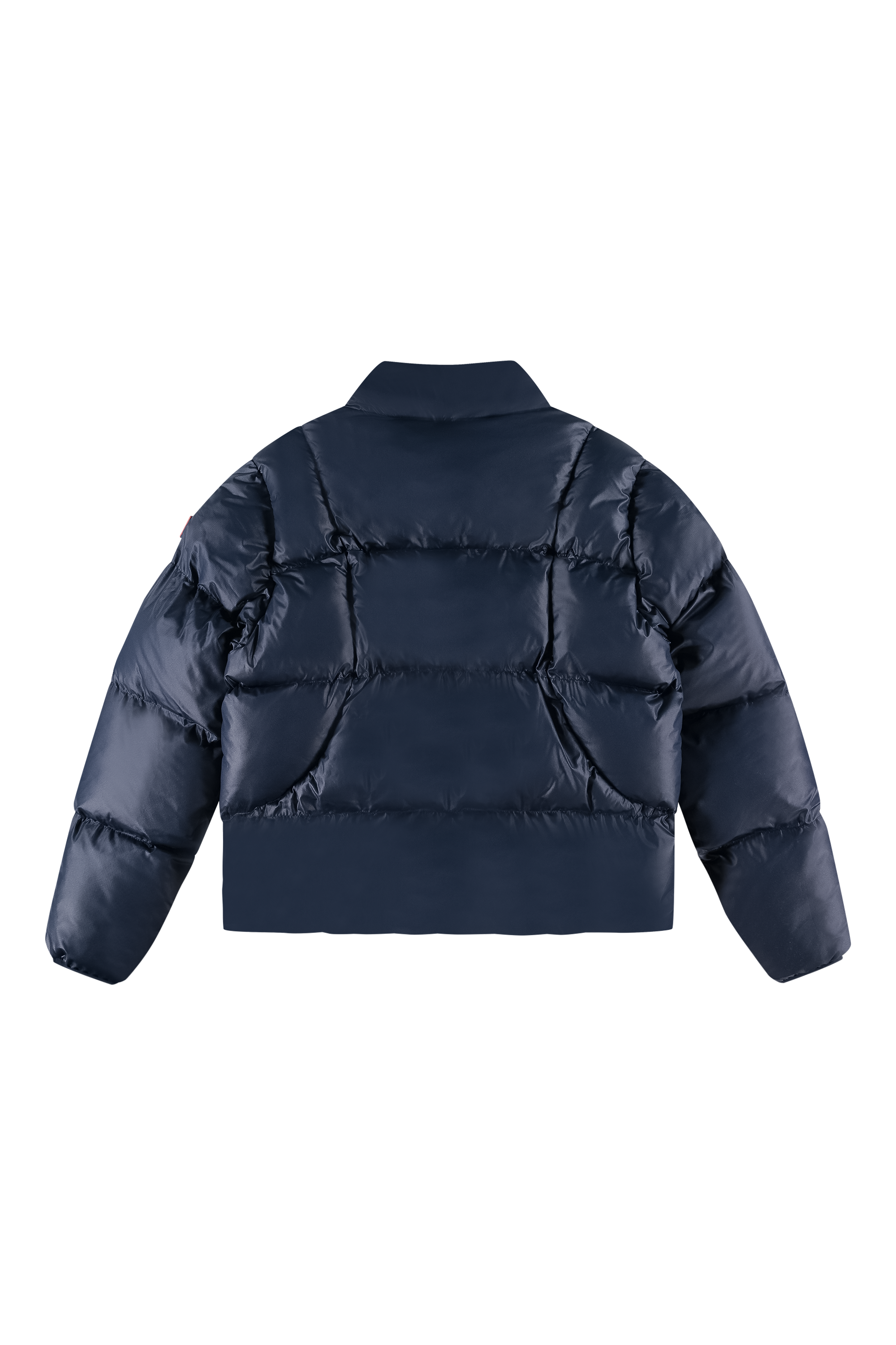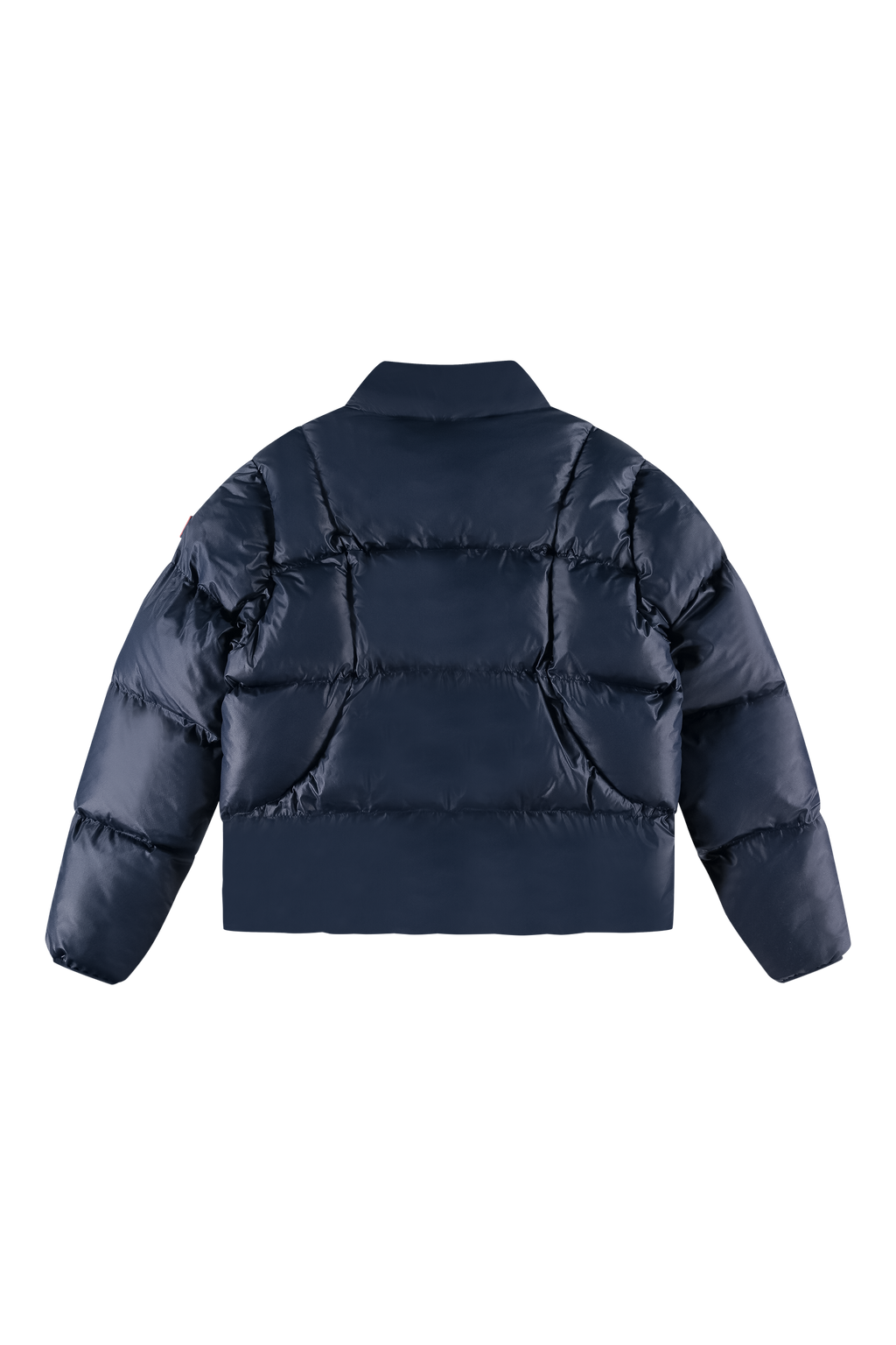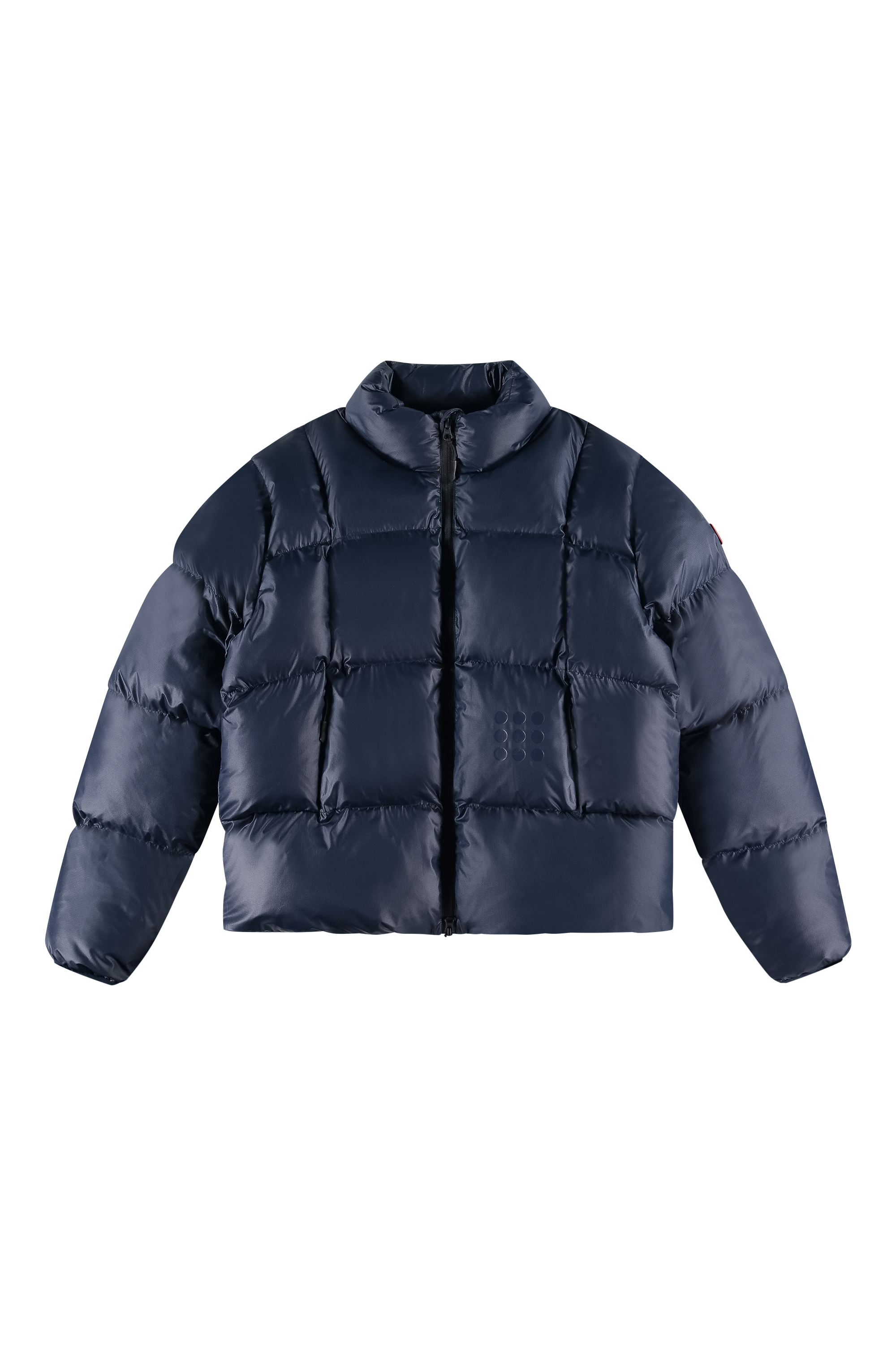 Introducing the 9-Dots Curve Puffer Jacket in Navy Blue. Crafted with a modern curved lining, this jacket features our signature 9-Dots logo and offers premium warmth without the bulk. The shell and filling are made entirely from recycled plastic bottles.
