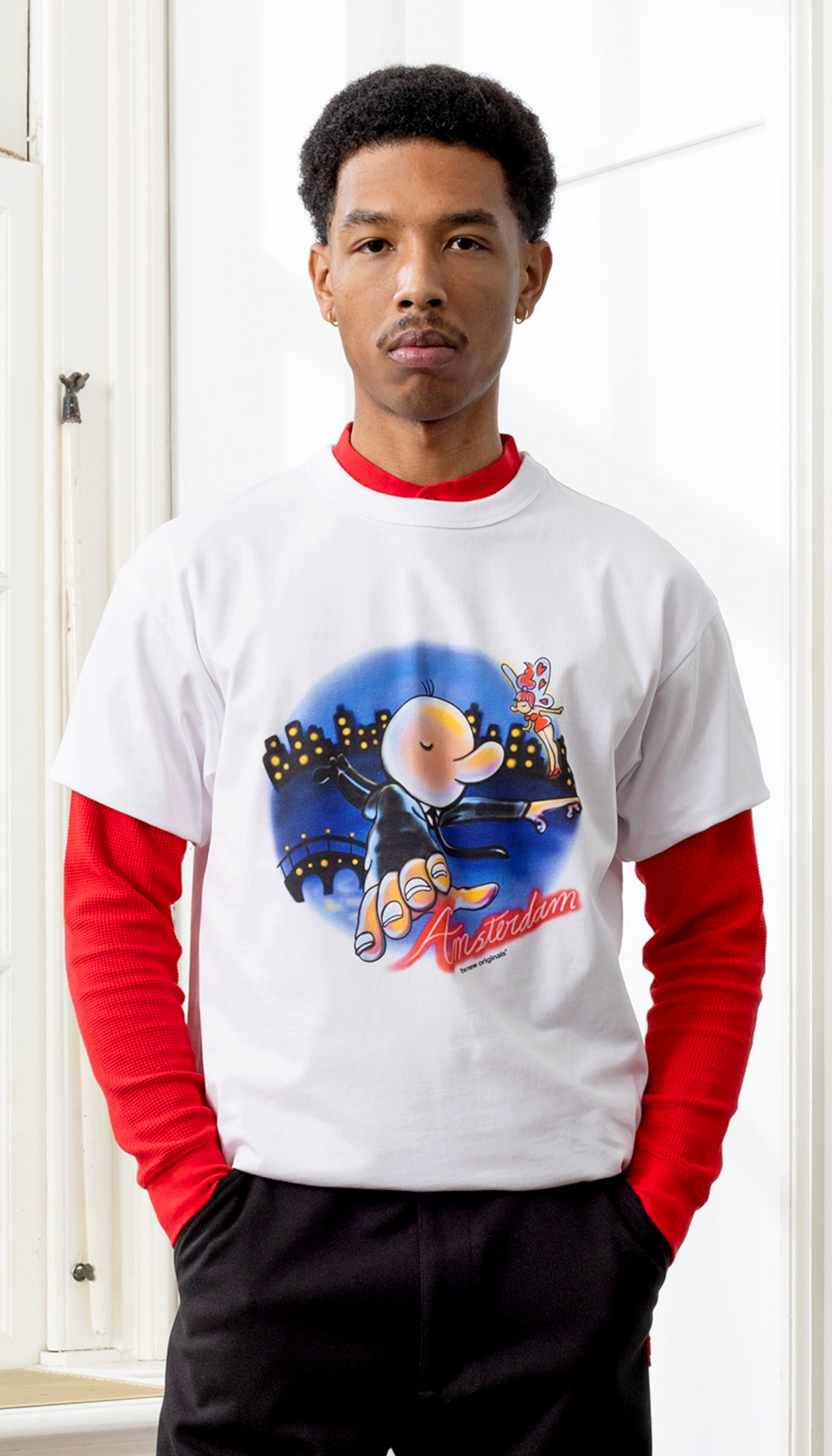 The Flying Freddy Tee in White features a playful airbrush-style graphic of our mascot Freddy soaring above an Amsterdam skyline. The artwork blends cartoon energy with city pride. Made from 100% soft cotton.