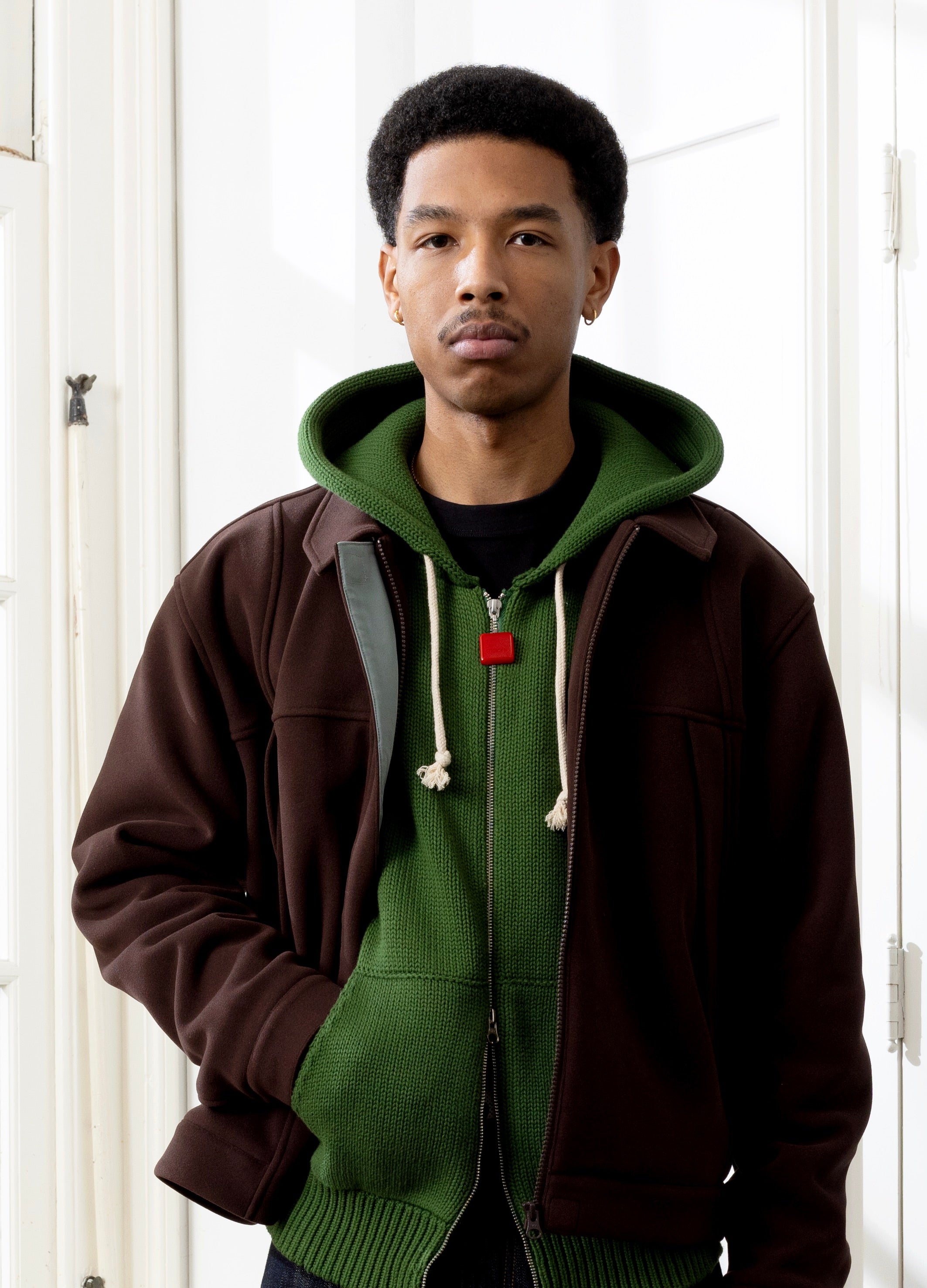 Chunky Knit Zip Up Hoodie in Forest Elf is crafted from a heavyweight knit for warmth and structure, it features a full zip closure, kangaroo pockets, and contrast cream drawstrings finished with a bold red accent *bead*.