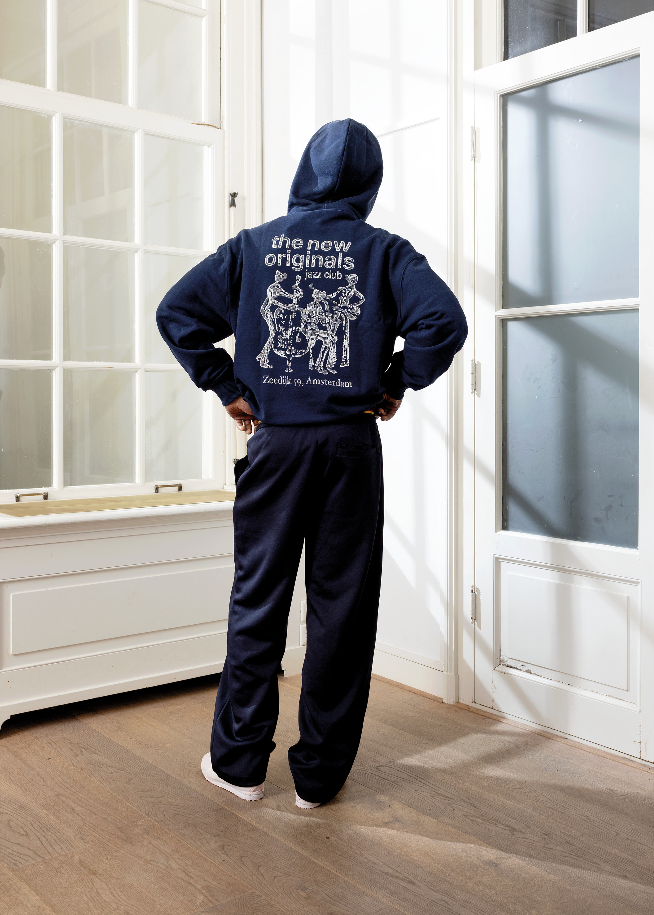 The Jazz Club Hoodie in Navy Blue features a relaxed fit and heavyweight cotton build. The back graphic riffs on classic jazz posters, spotlighting a trio of musicians mid-performance, while the front keeps it clean with embroidered the new originals jazz club branding. Finished with ribbed cuffs and hem, and a kangaroo pocket.