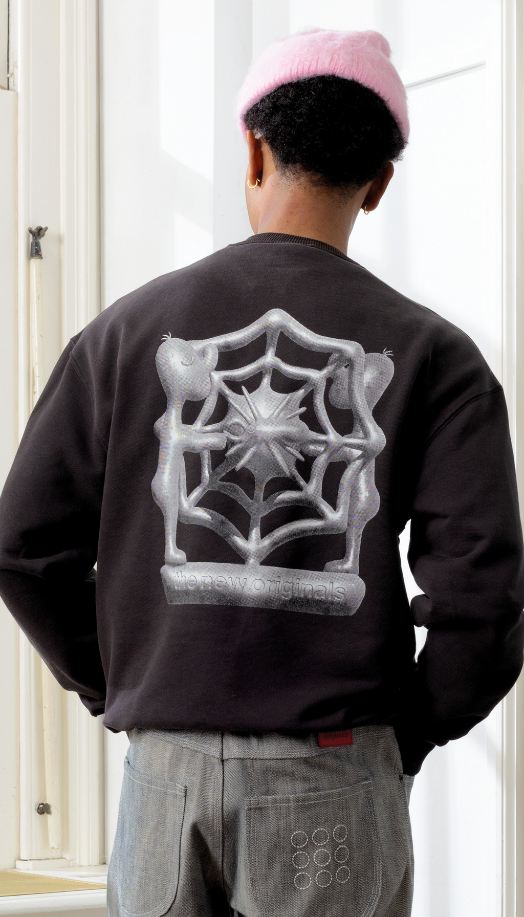 This crewneck features a large 3D-style graphic on the back, inspired by the Ananse symbol, a West African sign for creativity. The design reimagines the symbol with two versions of our mascot Freddy, styled as spiders, weaving the web together.
