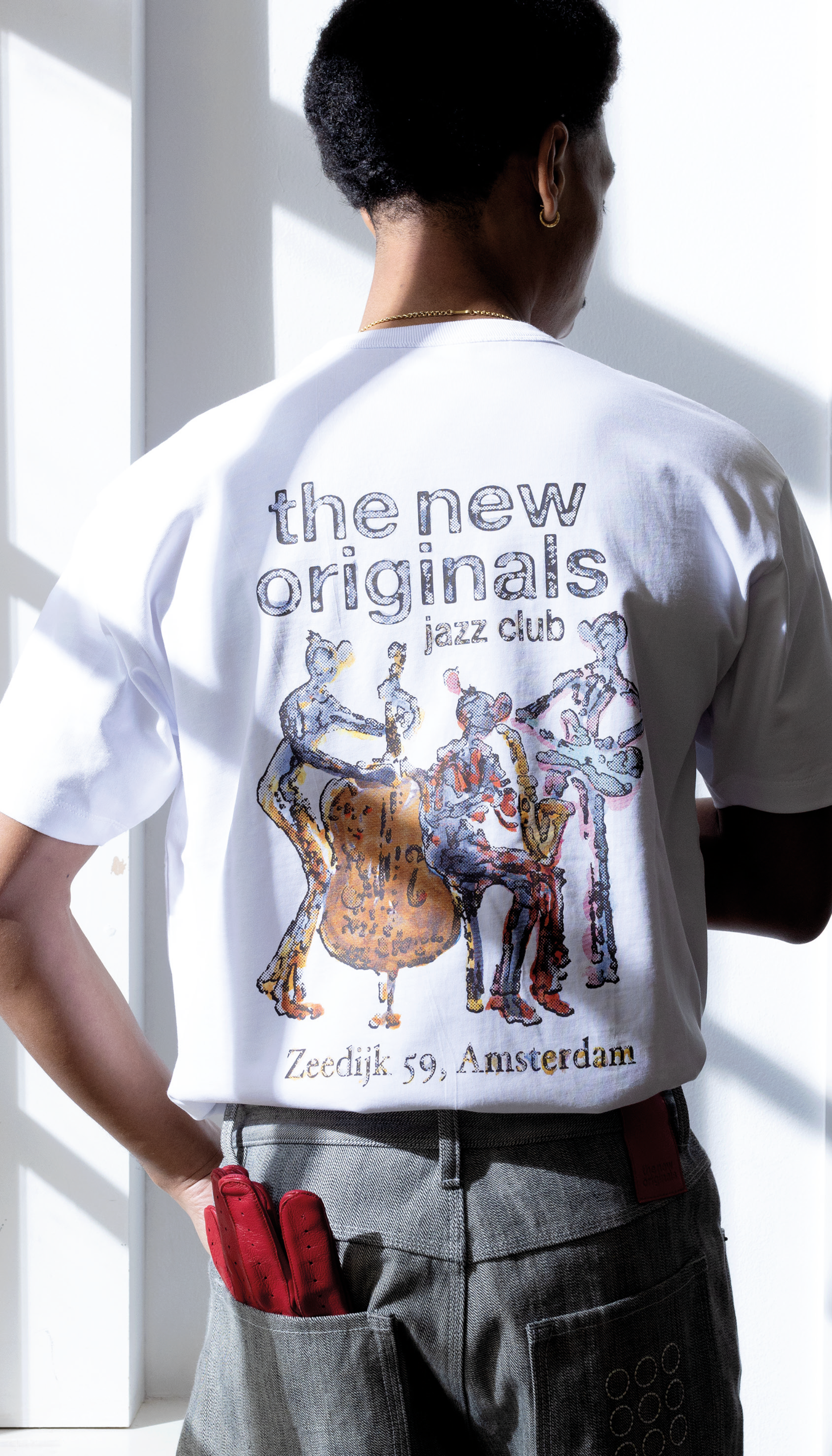 The Jazz Club Tee in White. The back graphic riffs on classic jazz posters, spotlighting a trio of musicians mid-performance, while the front keeps it clean with screen-printed the new originals jazz club branding.