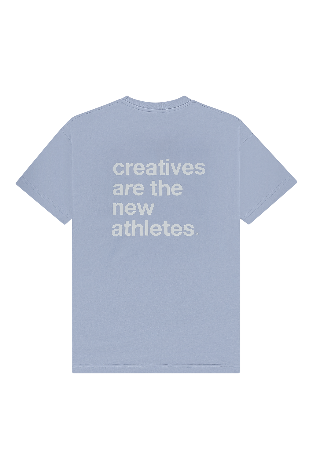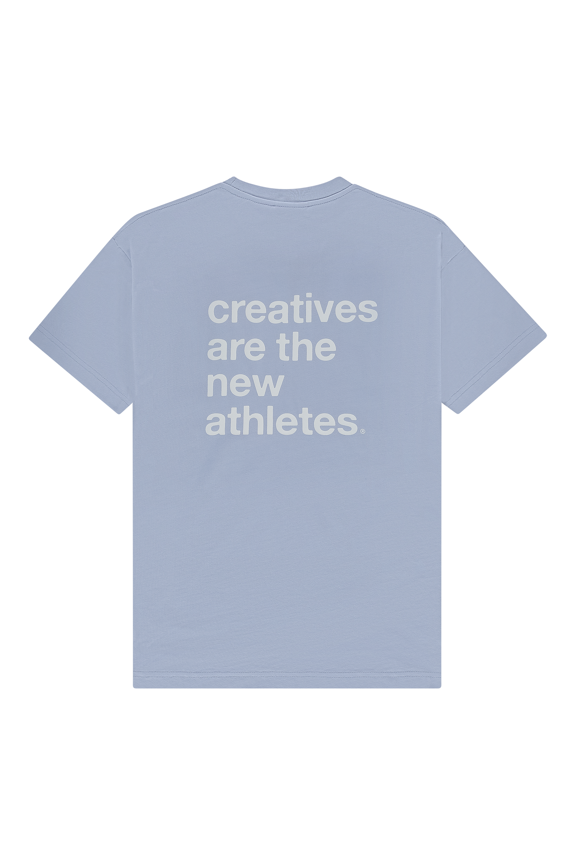 The Catna Tee in Lush Blue features our classic Emblem logo embroidered on the left chest, while the back carries our statement phrase: Creatives Are The New Athletes, screen-printed in Pink.
