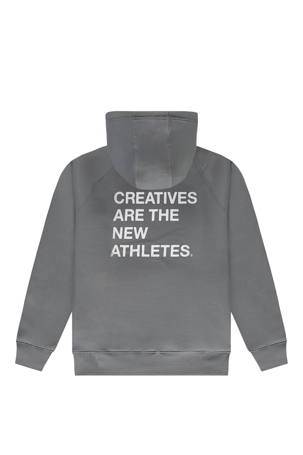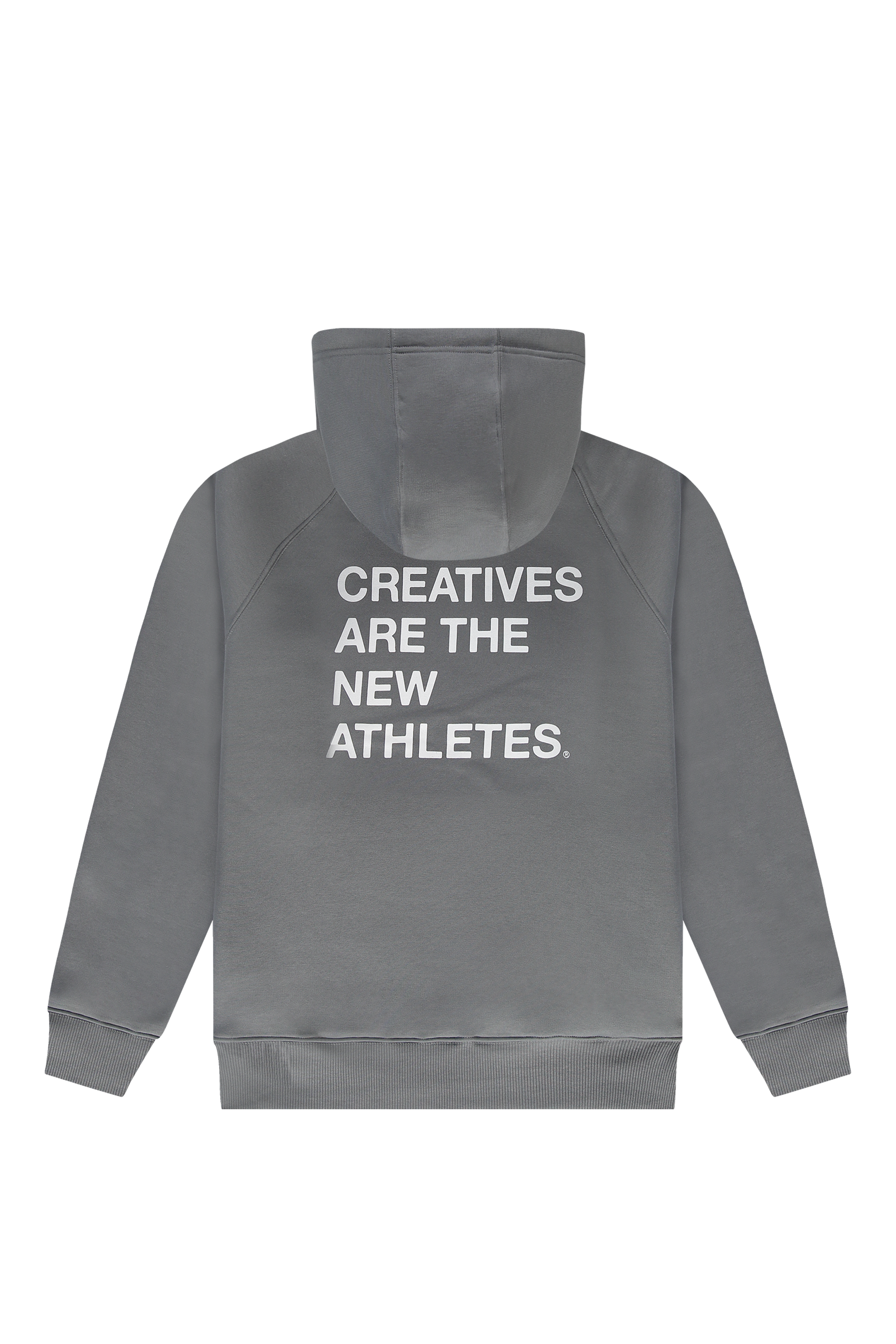 The rebranded CATNA Hoodie in Iron Gate features our Emblem logo embroidered on the left chest and our bold CATNA phrase “Creatives Are The New Athletes” printed across the back.