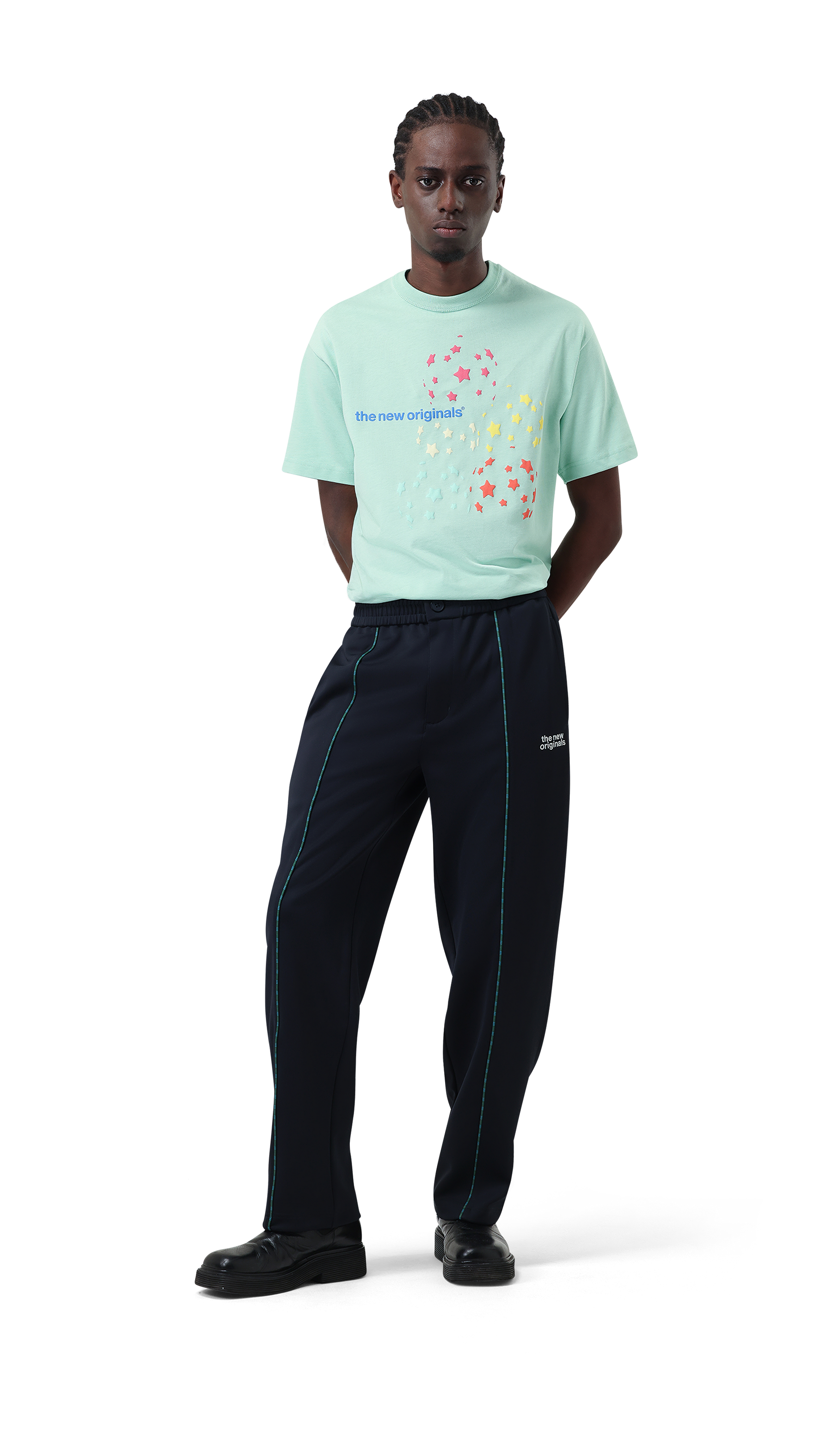 The Starburst Tee brings color and movement to a clean mint base. A cluster of multicolored stars forms a playful graphic around the logo, giving the shirt a bright, energetic feel. Simple front print, strong visual impact.