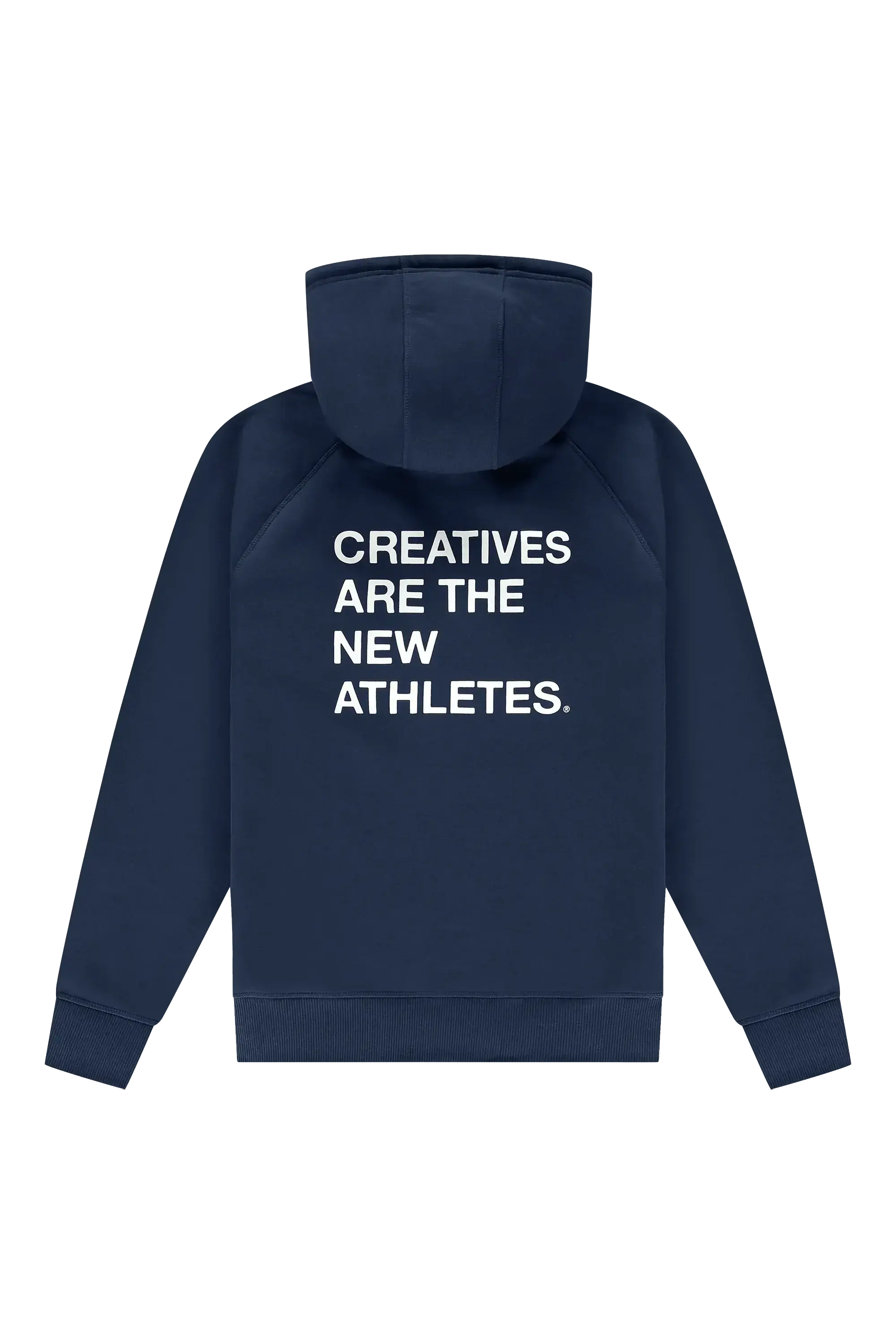 The rebranded CATNA Hoodie in Navy Blue features our Emblem logo embroidered on the left chest and our bold CATNA phrase “Creatives Are The New Athletes” printed across the back.
