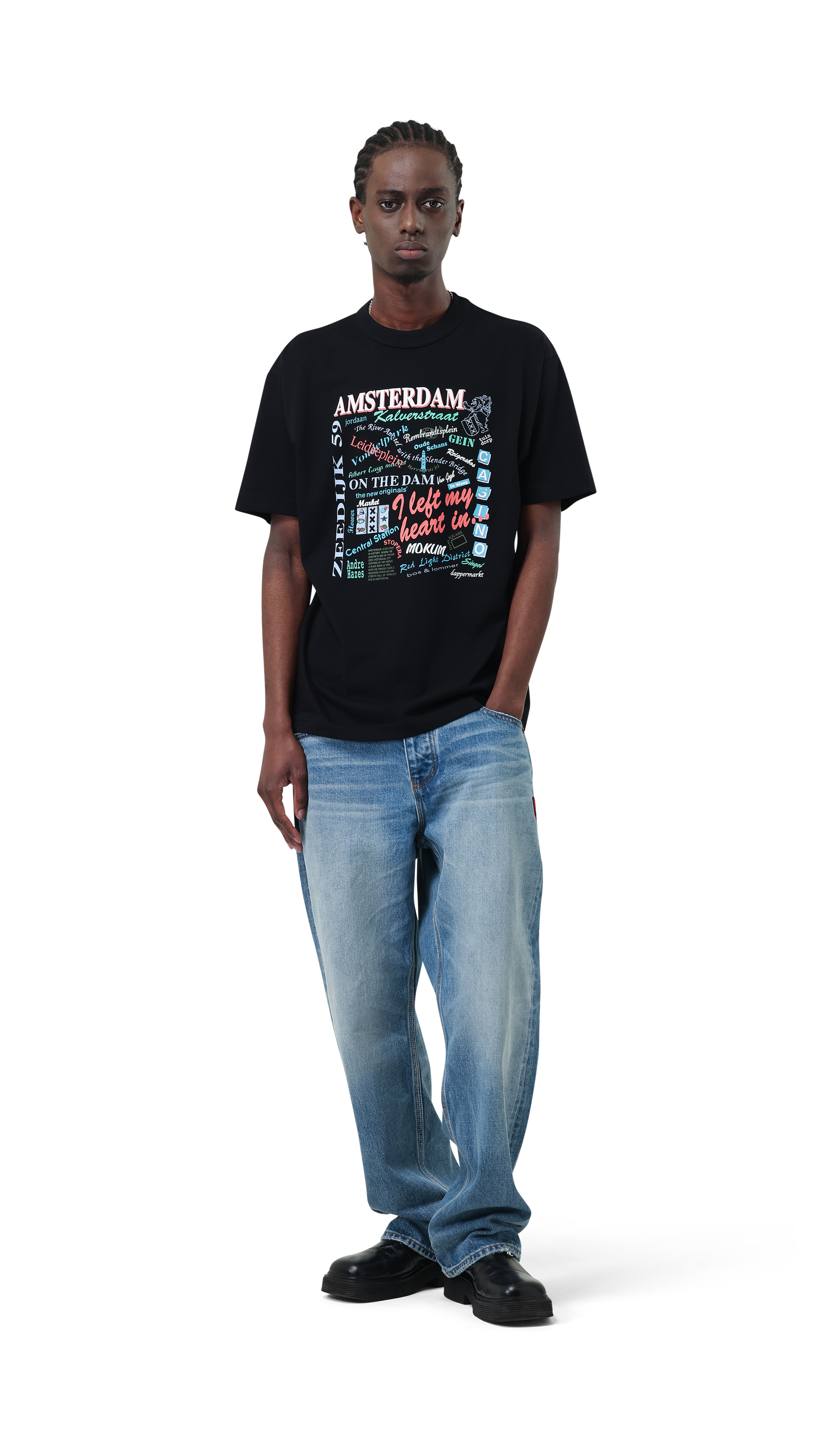 The Souvenir Tee is our tribute to Amsterdam. The front features a collage of iconic streets, landmarks, and local references that shape the city. From Zeedijk 59 to Kalverstraat, from the market to the nightlife. A graphic that feels like walking through Amsterdam.